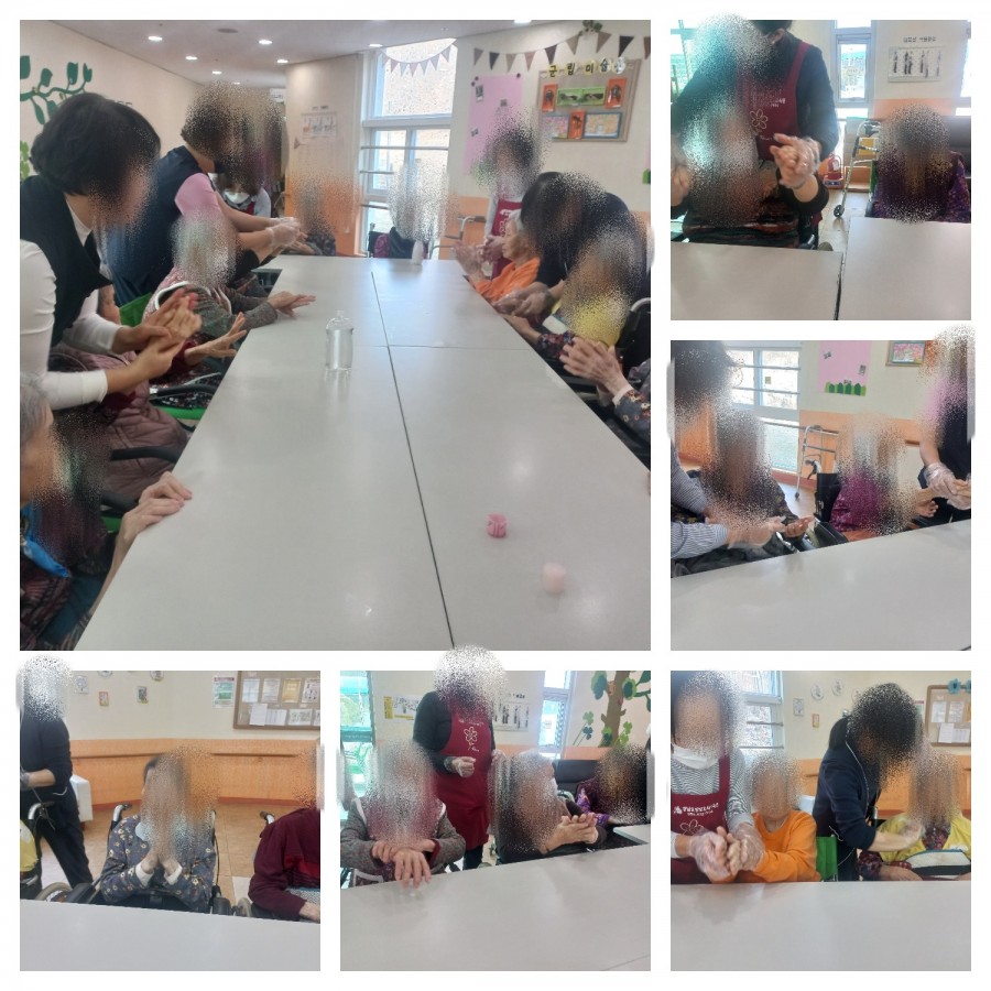 마사지 후에는 요양보호사와 주위 어르신들과 함께 손바닥을 마주치며 두드리는 활동을 통해 자연스러운 신체 접촉과 교류를 나누었습니다.