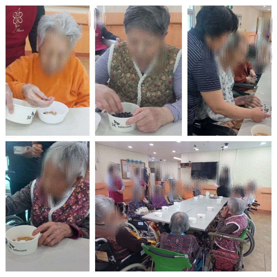 흰콩, 팥, 서리태 등 여러 종류의 콩을 하나씩 골라보는 인지 프로그램을 진행하였습니다.