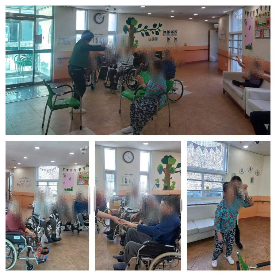 익숙한 음악에 맞추어 팔과 다리를 천천히 움직이며 몸을 풀어보고, 무리가 가지 않는 범위 내에서 동작을 따라 하실 수 있도록 유도하였습니다.