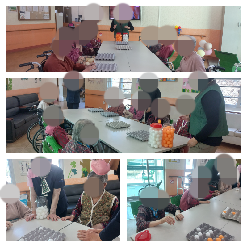 또 다른 방법으로는 오목게임처럼 번갈아가며 넣어보는 방식으로 설명을 드렸지만, 어르신들께서는 다소 이해하기 어려워하시기도 하셨습니다. 그래도 공을 튕겨 계란판에 넣어보며 “마음대로 잘 안 된다”고 말씀하시면서도 즐거워하시며 밝은 분위기 속에서 활동에 참여하셨습니다.