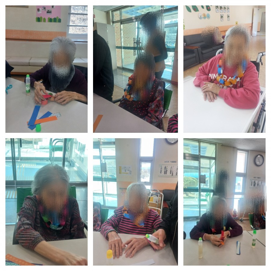 같은 크기로 자른 색종이를 활용하여 고리를 연결해 목걸이를 만드는 만들기 활동을 진행하였습니다. 활동 전 방법을 충분히 설명드렸으며, 어르신들께서는 각자의 이해도와 표현 방식에 따라 다양한 모습으로 참여하셨습니다.