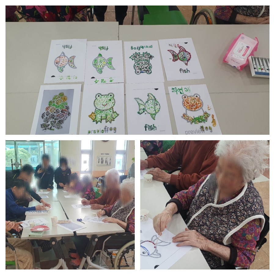어르신 개개인의 기분과 선호에 따라 포도, 개구리, 금붕어 등 다양한 주제를 선택하여 자유롭게 작품을 완성하셨습니다.