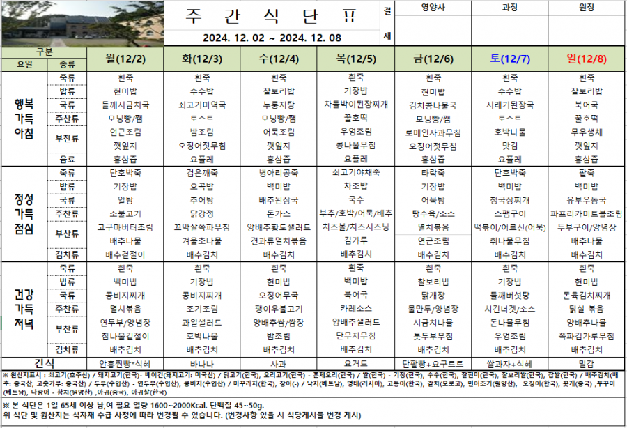 주간식단표 (24.12.1~12.7) 페이지 정보 작성자 관리자 작성일 24-11-29 09:41 조회 139회 댓글 0건 본문 본격적인 겨울로 접어들었습니다.속까지 따듯해 지는 겨울나기 음식들을 많이 준비하였습니다. 이전글2024년 12월 3주차 식단표 목록 댓글목록 0 댓글목록 등록된 댓글이 없습니다.